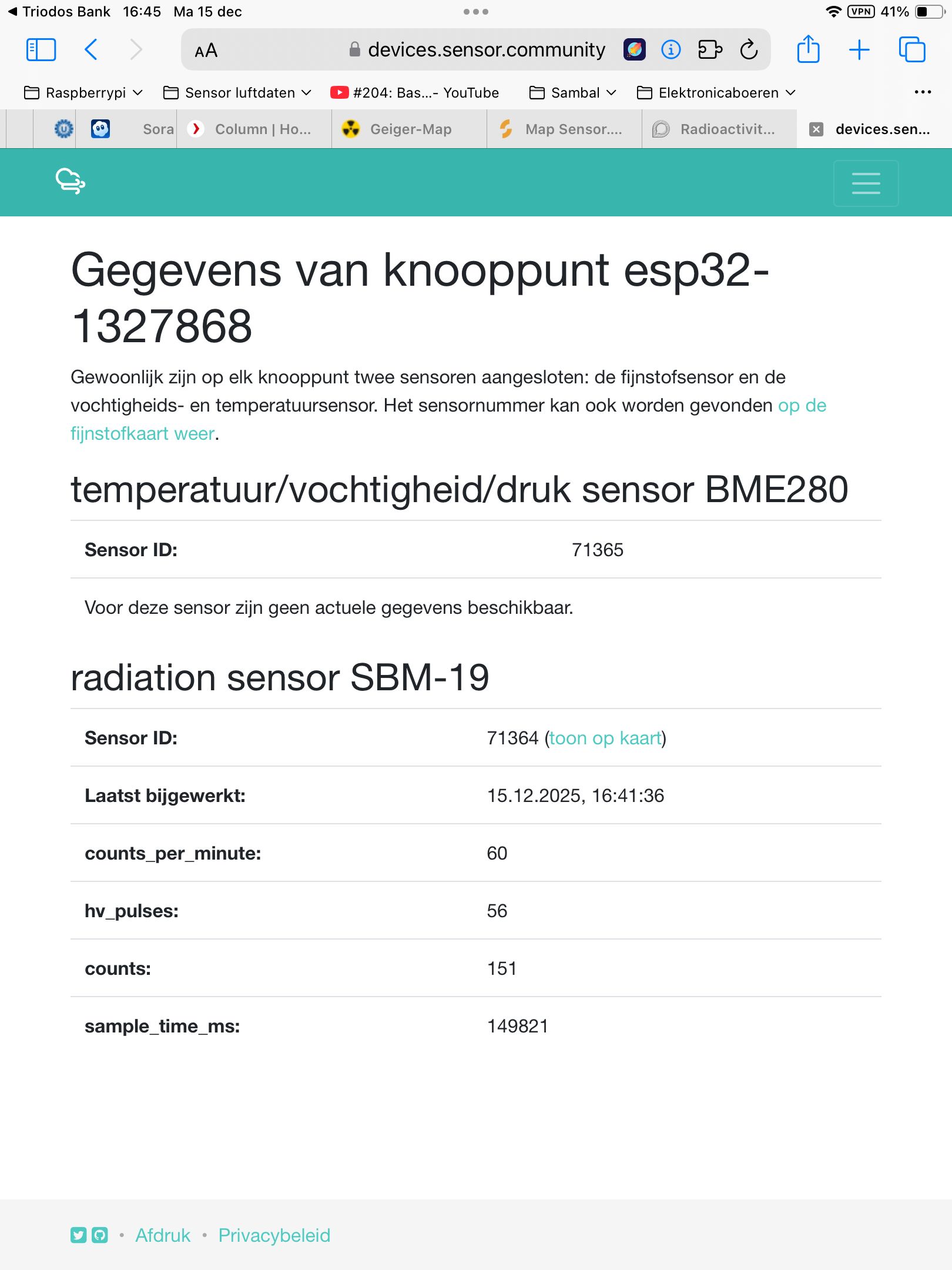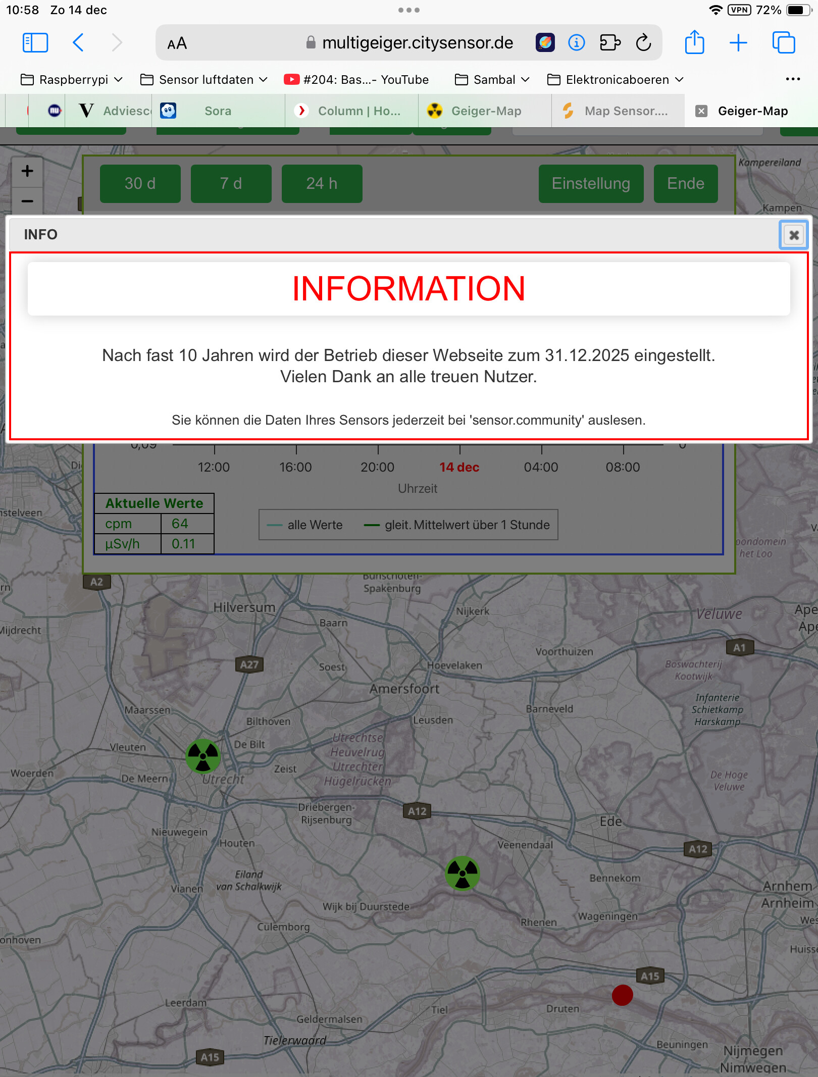 Hi, apart from my sensors for air quality and noise I have a multigeiger for measuring background radiation. The multigeiger had to be registered in devices.sensor.community and the values show up in archive.sensor.community. The site where the multigeigers are displayed, multigeiger.citysensor.de, is going to stop at the end of this year. In the graph was said that the values will be accessible on sensor.community.